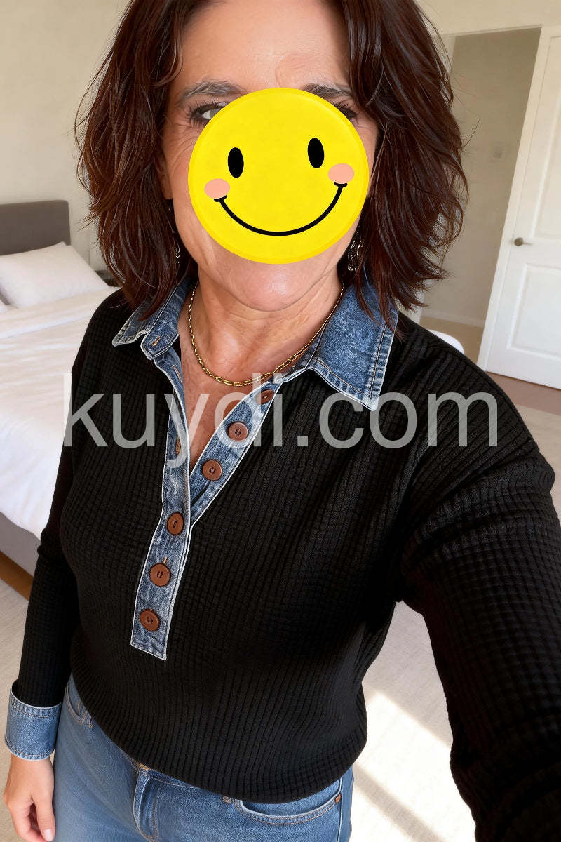 Cool Long Sleeve Denim Collar Button Front Top