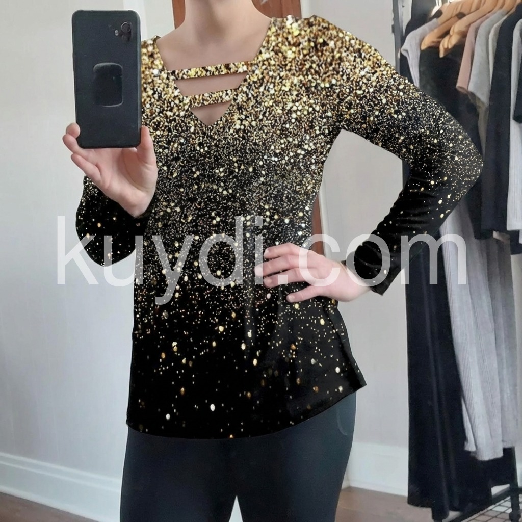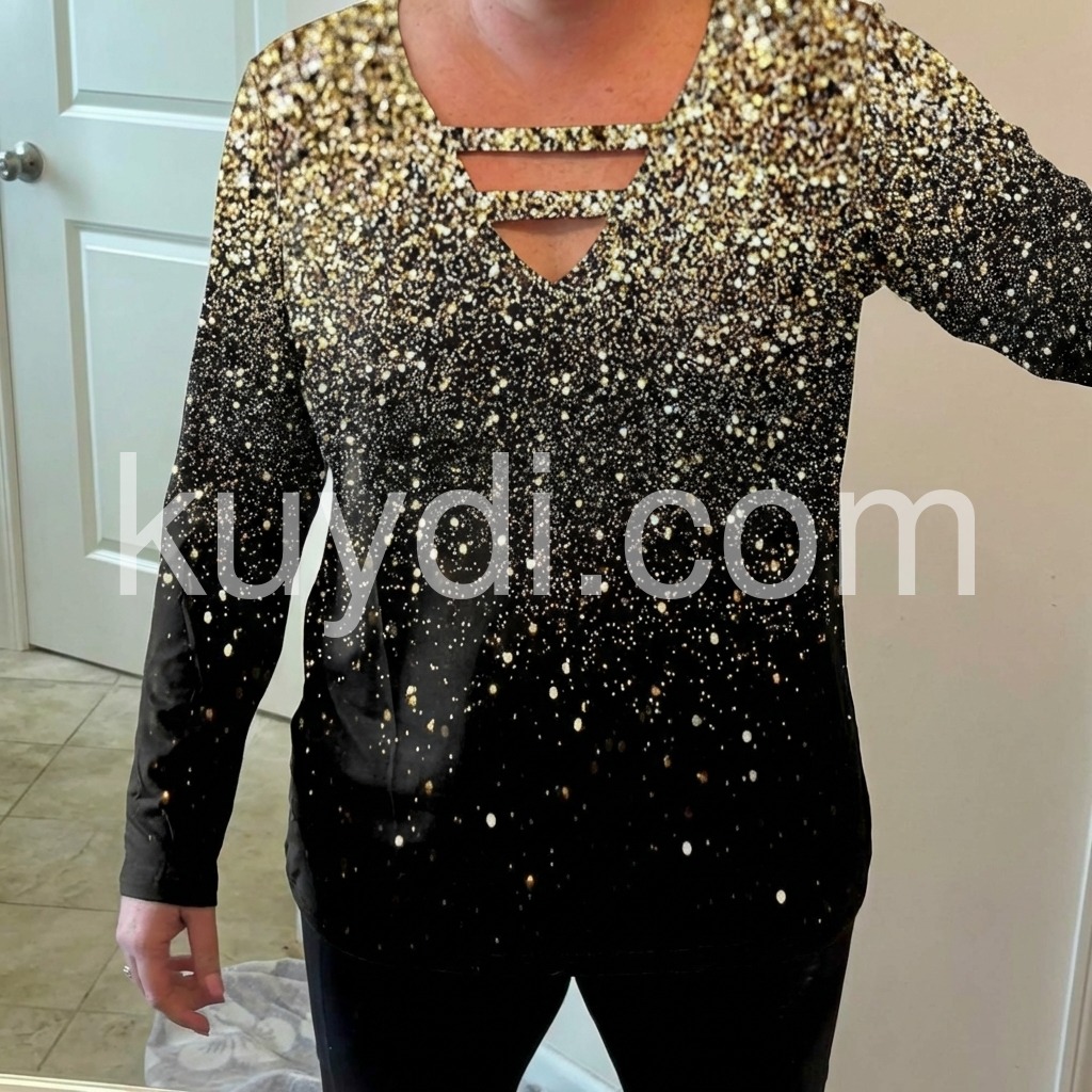 Just in time for your next glam holiday vacay! This sultry, strappy caged shirt has a v-neckline that awaits your favorite layering necklaces or statement jewels. This unique long-sleeved top sparkles with a generous sprinkle of metallic ombre silver and gold print, perfect for pairing with jeans or black slacks, boots, and metallic heels. Machine wash cold tumble dry low to medium heat. Iron if needed or lay flat to dry.