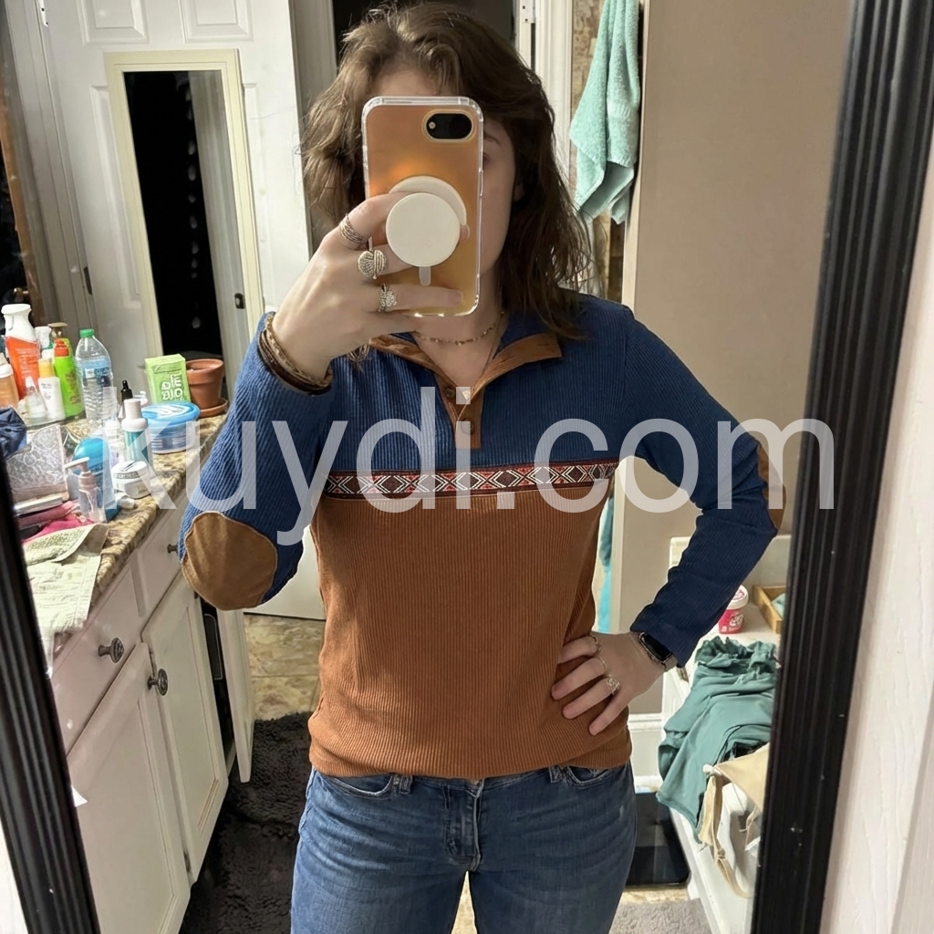 Elevate your casual wardrobe with this sophisticated brown long sleeve top, featuring contrasting color block panels that add visual interest and dimension. The signature elbow patches deliver timeless preppy appeal while reinforcing high-wear areas for enhanced durability. Crafted for versatility, this piece transitions seamlessly from weekend errands to relaxed office settings. The structured long sleeves provide coverage and warmth, making it an ideal layering piece for transitional seasons. A refined choice for those who appreciate understated style with functional design details.