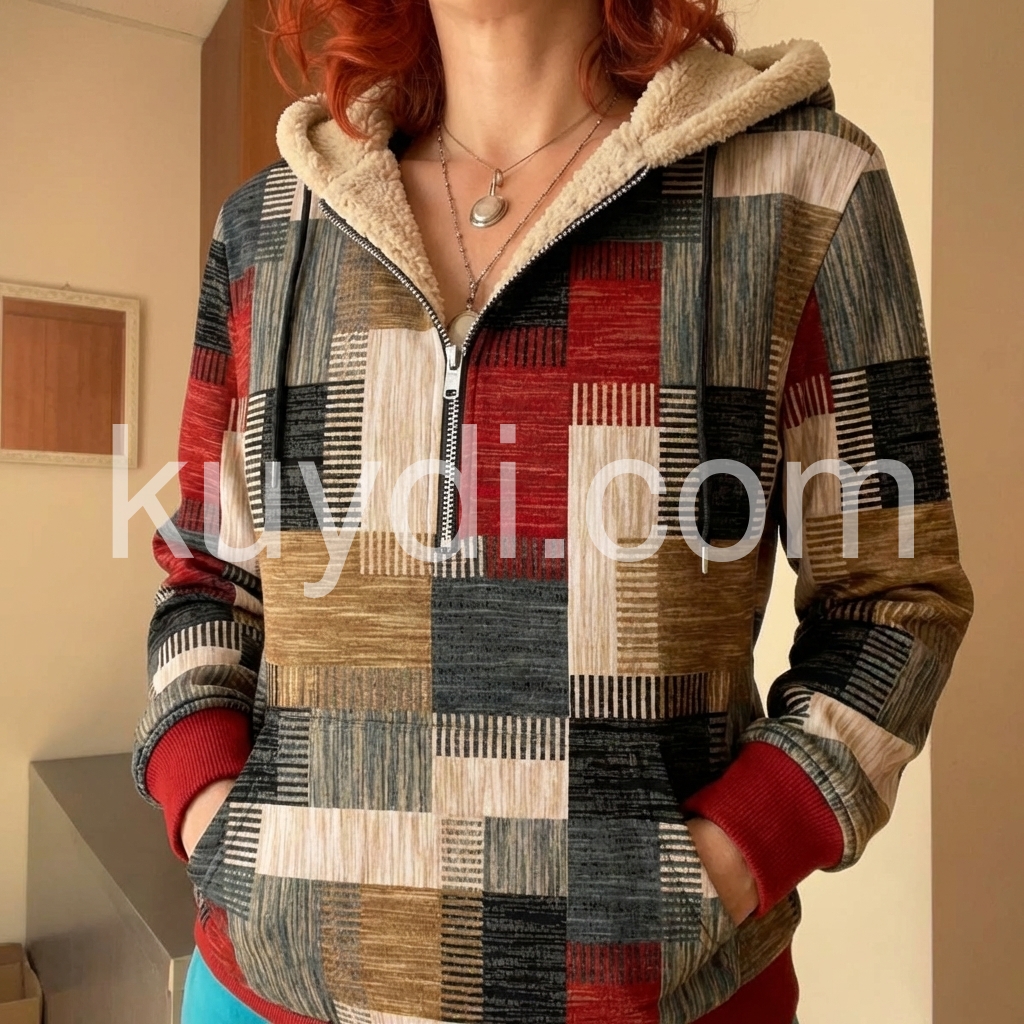 I bought this zip-up top for a casual weekend look, and it exceeded my expectations. The patchwork-style design is unique and modern, and the colors are well-balanced rather than overwhelming. The collar adds that cozy touch, and the overall construction feels solid. It’s easy to pair with jeans or leggings, and it looks great in every lighting situation.