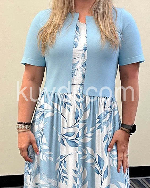 Unique Blue Plant Print Midi Dress With Jacket