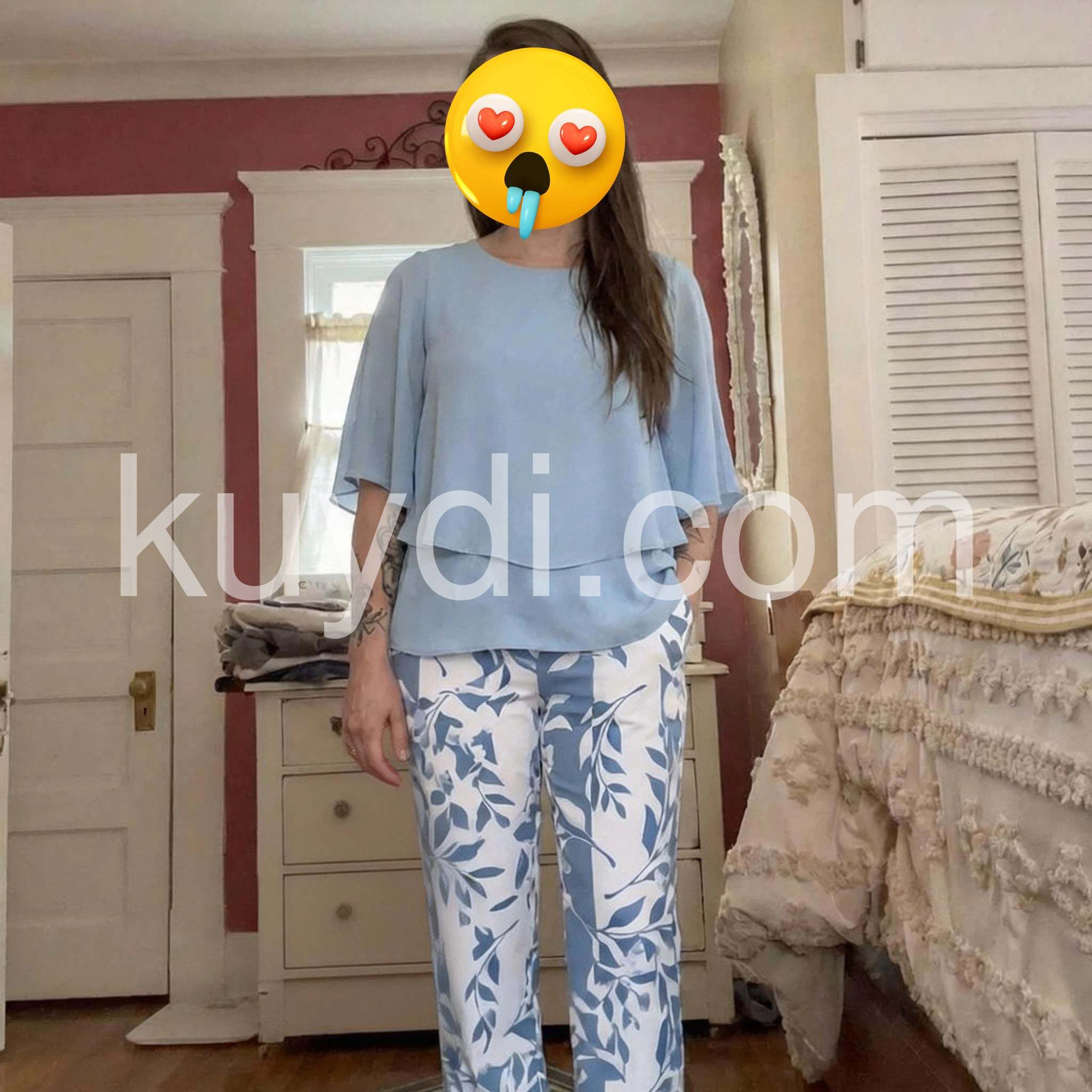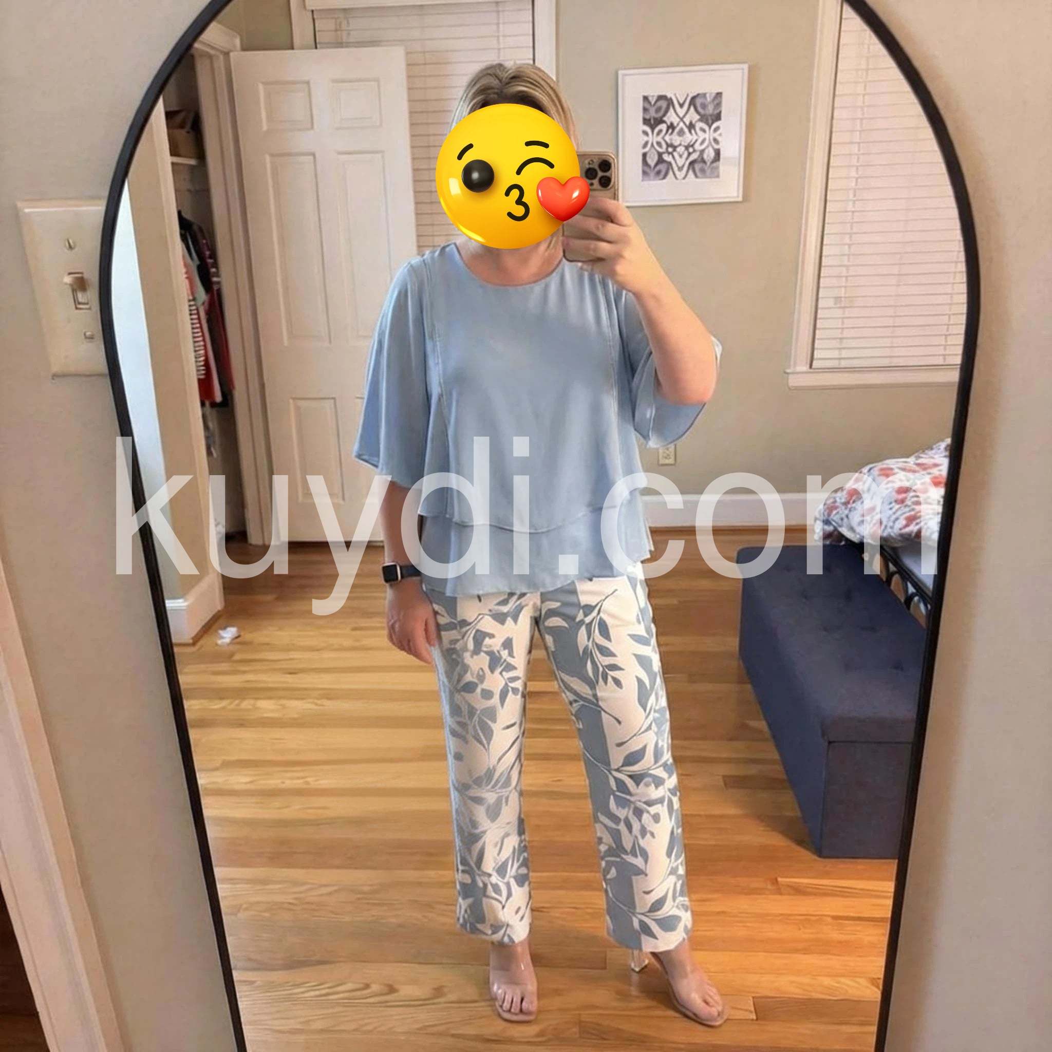 I wore this two-piece set on a recent cruise and received so many compliments! The light blue color is stunning, and the layered top perfectly hides any tummy insecurities. The pants are incredibly comfortable and flowy. Highly recommend for any summer vacation.