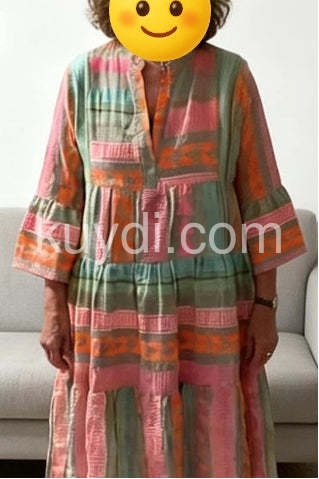 I absolutely love the vibrant colors and geometric patterns on this dress! It is super lightweight and perfect for summer. The fit is loose and flowy, which makes it incredibly comfortable for hot days.