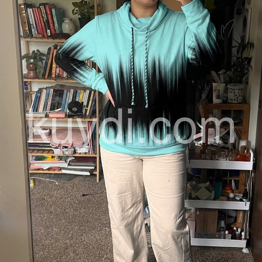 This ombre hoodie is a total game-changer for my casual wardrobe! The mint-to-black gradient is so eye-catching and unique, never seen anything quite like it. The soft, lightweight fleece feels amazing against my skin, and the cowl neck with drawstrings is perfect for snuggling up on cool days. It’s super comfy, fits true to size, and the bold print instantly elevates a simple jeans-and-tee look. I’ve gotten so many compliments whenever I wear it out!