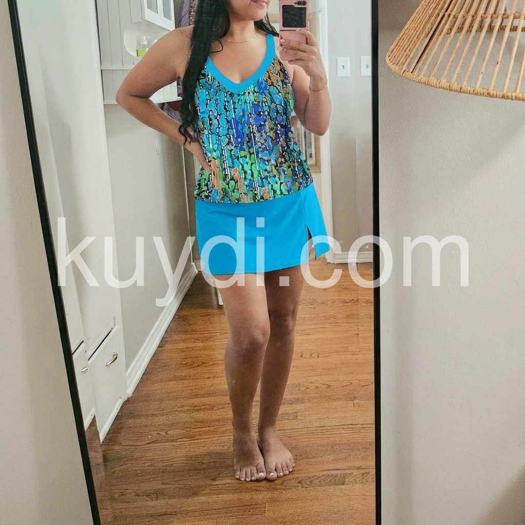 Very flattering to figure. Accentuates the waist and hides my upper thighs. If you're like me and a tad insecure about showing your booty or belly, this suit covers those areas and is super flattering on. I feel very comfortable and confident in this bathing suit.