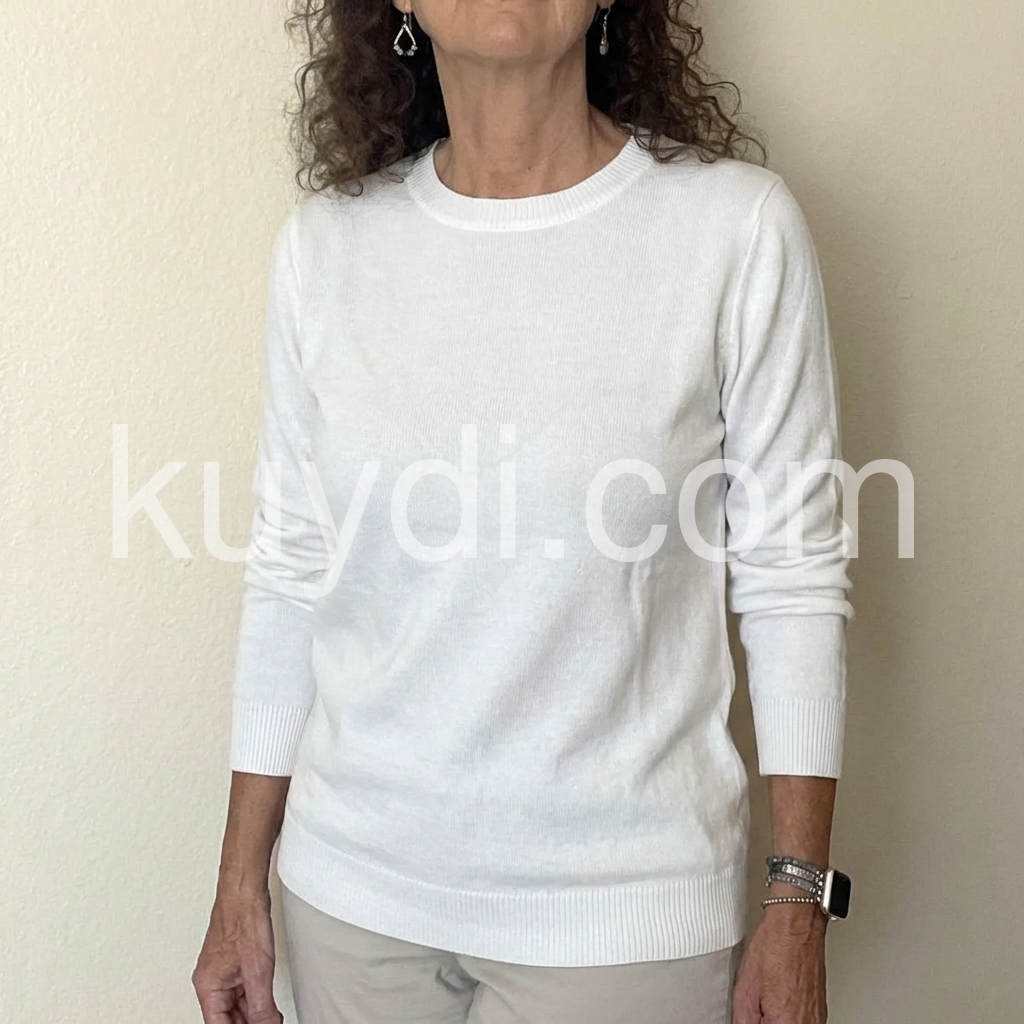 This soft white sweater features a classic round neck and ribbed knit design, offering both comfort and refined texture. Its plain, versatile style makes it an ideal layering piece for various outfits, while the quality knit ensures durability and a flattering fit. Perfect for maintaining warmth without bulk, it delivers understated elegance suitable for professional and casual settings alike.