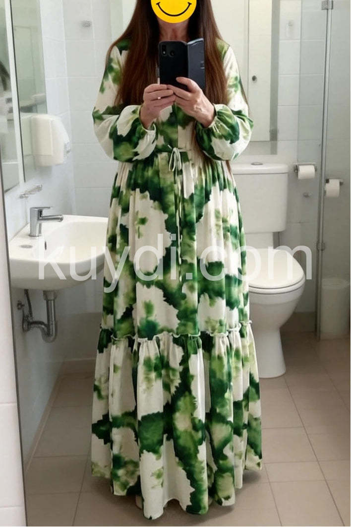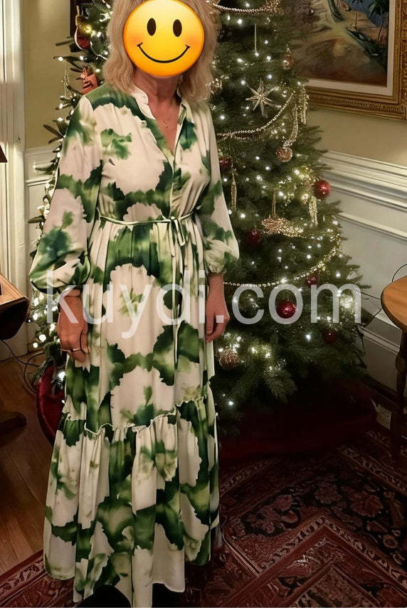 Green Long Sleeve V-Neck Maxi Dress
