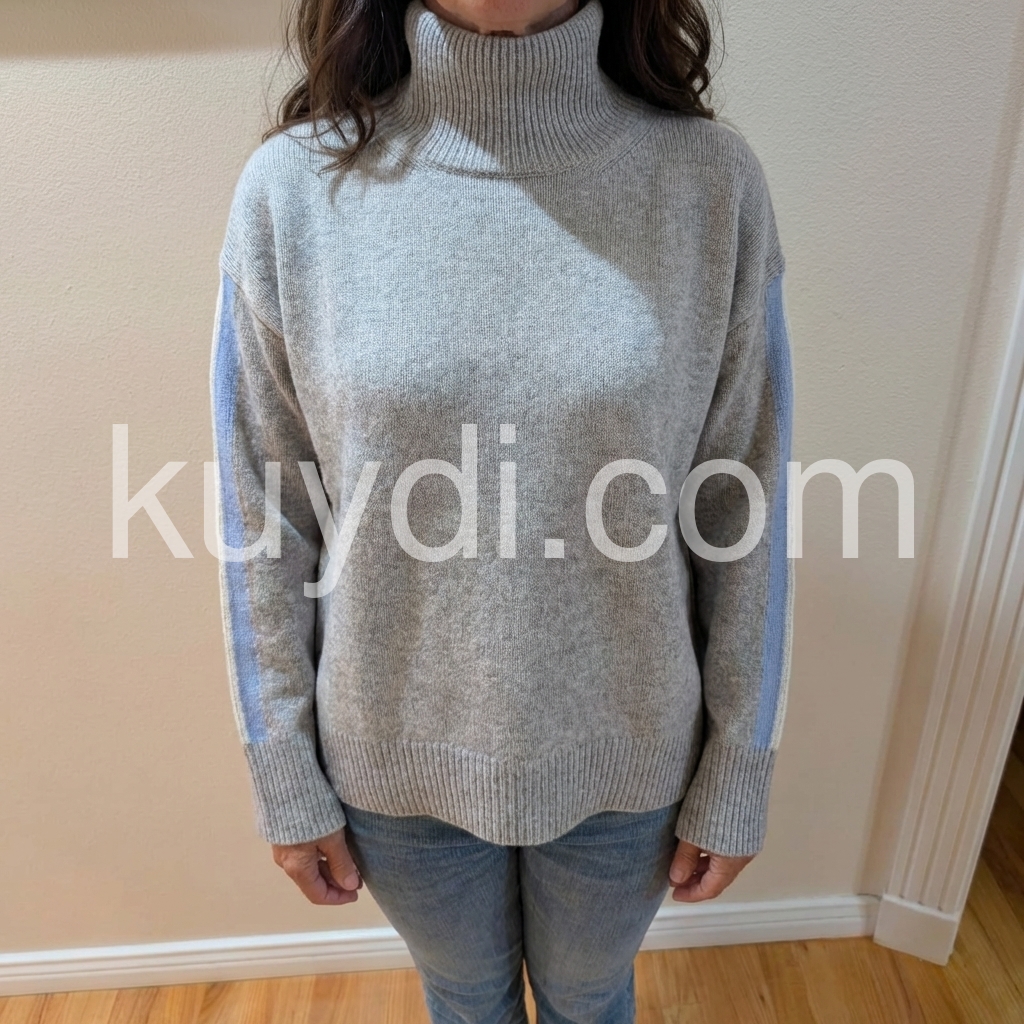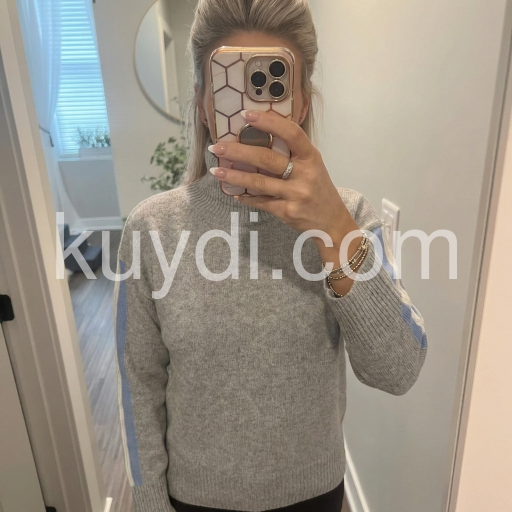 When I first received this grey sweater I wasn't sure if I liked it. One I tried it on I did like it. It fits well and I liked the design of the sweater. I like the high-neck, which isn't too cold. The sweater is comfortable and lightweight for cool days. I think it is a good value for the price.