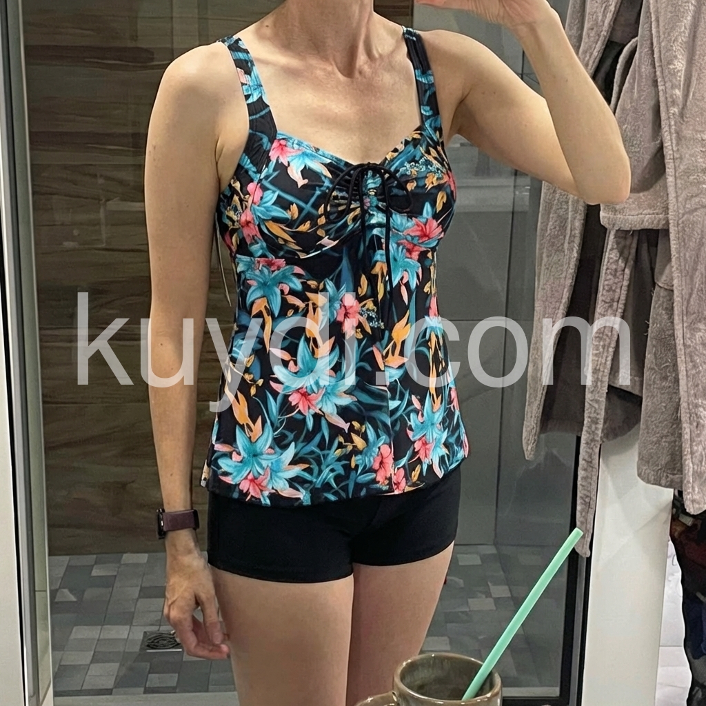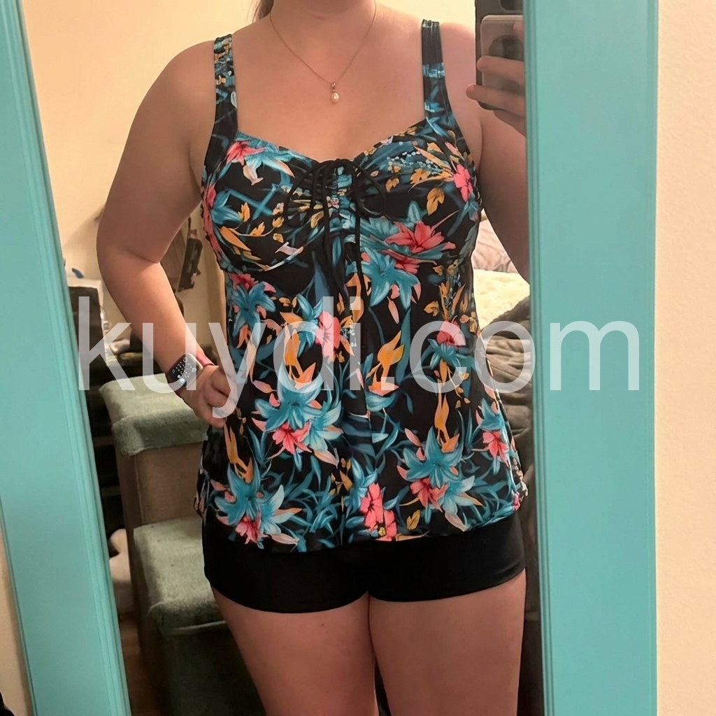I’m in love with this floral tankini! The dark base with bright blue and pink flowers is so chic, and the tankini top hides my midsection perfectly. The straps are adjustable for a secure fit, and the high-waisted shorts offer modest coverage. It’s lightweight and breathable, great for hot summer days. I’ve received so many compliments—definitely my new favorite swimwear!