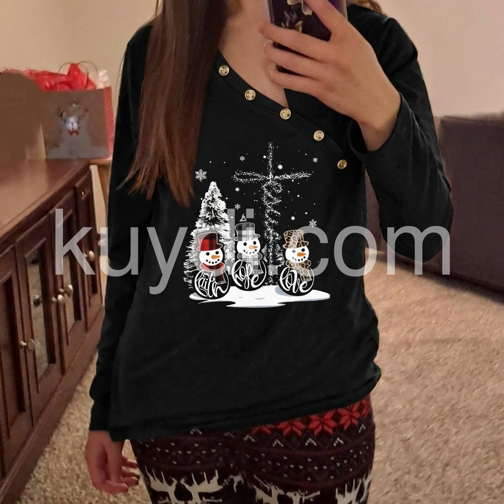 Add this cozy long sleeve top to your winter wardrobe, featuring adorable snowmen and a Cross, a Christmas tree, and falling snowflakes that set the stage for a super-fun holiday party, Christmas vacation, and so much more. An asymmetrical button front collar gives it a contemporary vibe.