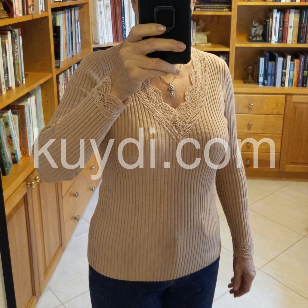 I’m really impressed by the craftsmanship of this cream knit sweater. The scalloped lace trim at the neckline is such a beautiful design element, and it gives the top a classy, romantic vibe. The fabric looks cozy but not bulky, and the long sleeves make it perfect for cool days.