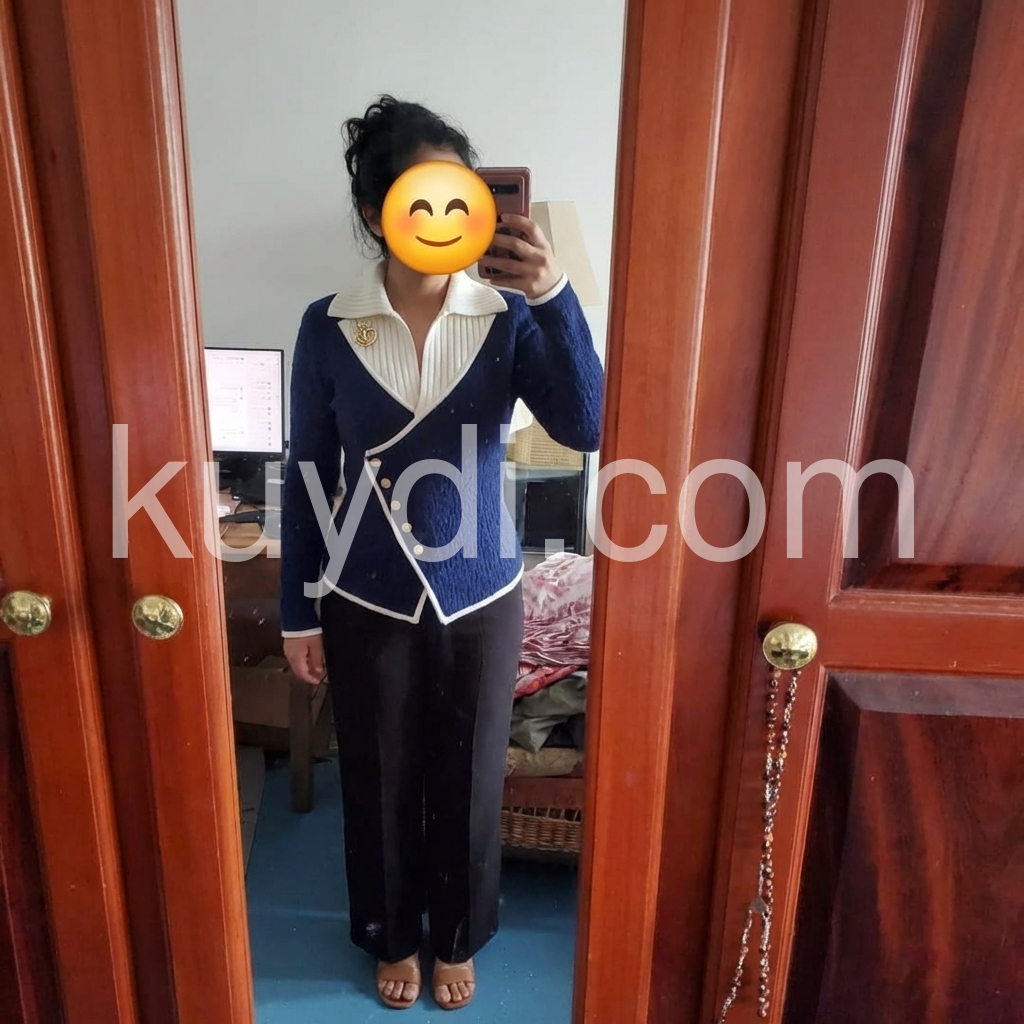 This sweater is stunning. The navy tone looks sophisticated, and the cream collar gives a clean, elegant contrast. I love the subtle details—especially the button placement and the way the design frames the neckline. It looks like something you’d see in a high-end boutique. Great quality and great style.