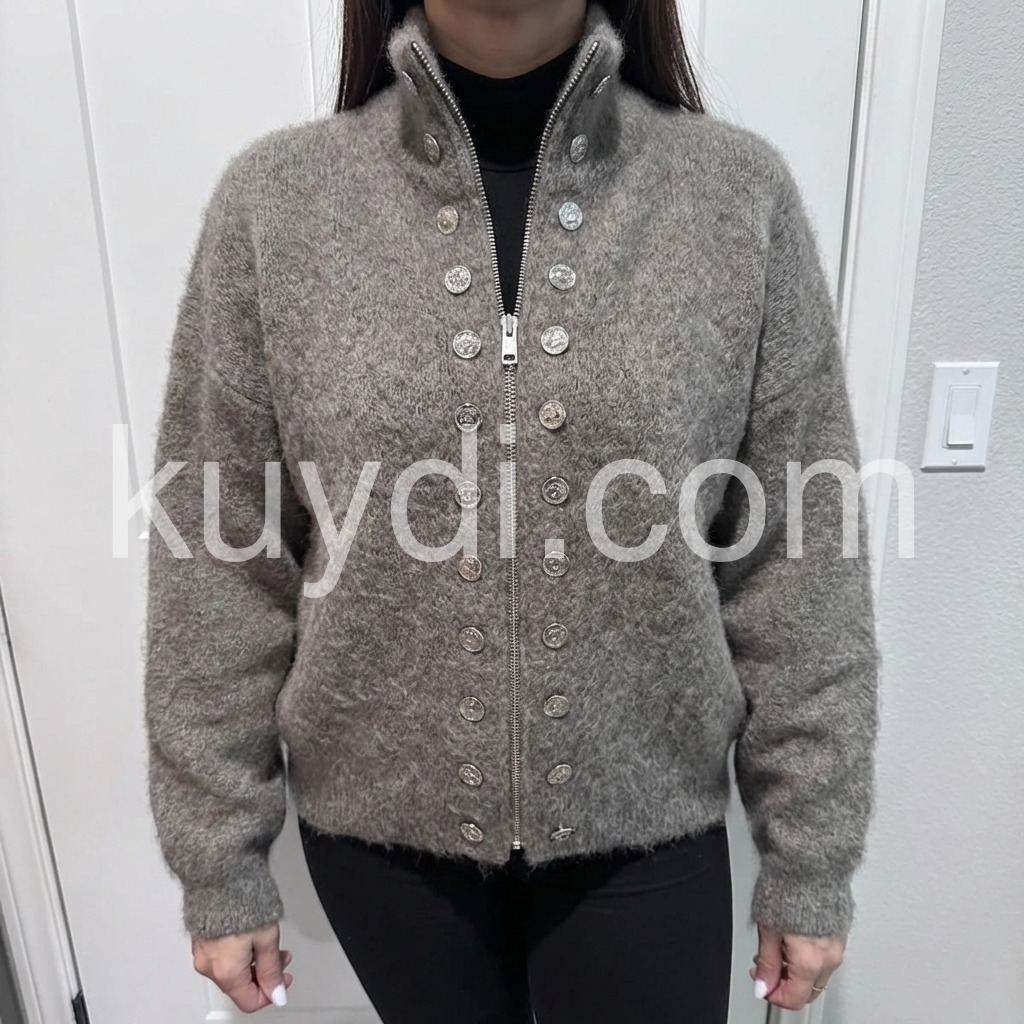 The Fuzzy Grey High Neck Long Sleeve Cardigan is a cozy and stylish addition to any wardrobe. Made with a high neck and long sleeves, it provides warmth and comfort during colder months. The fuzzy texture adds a touch of softness and style, making it a versatile piece for any outfit.