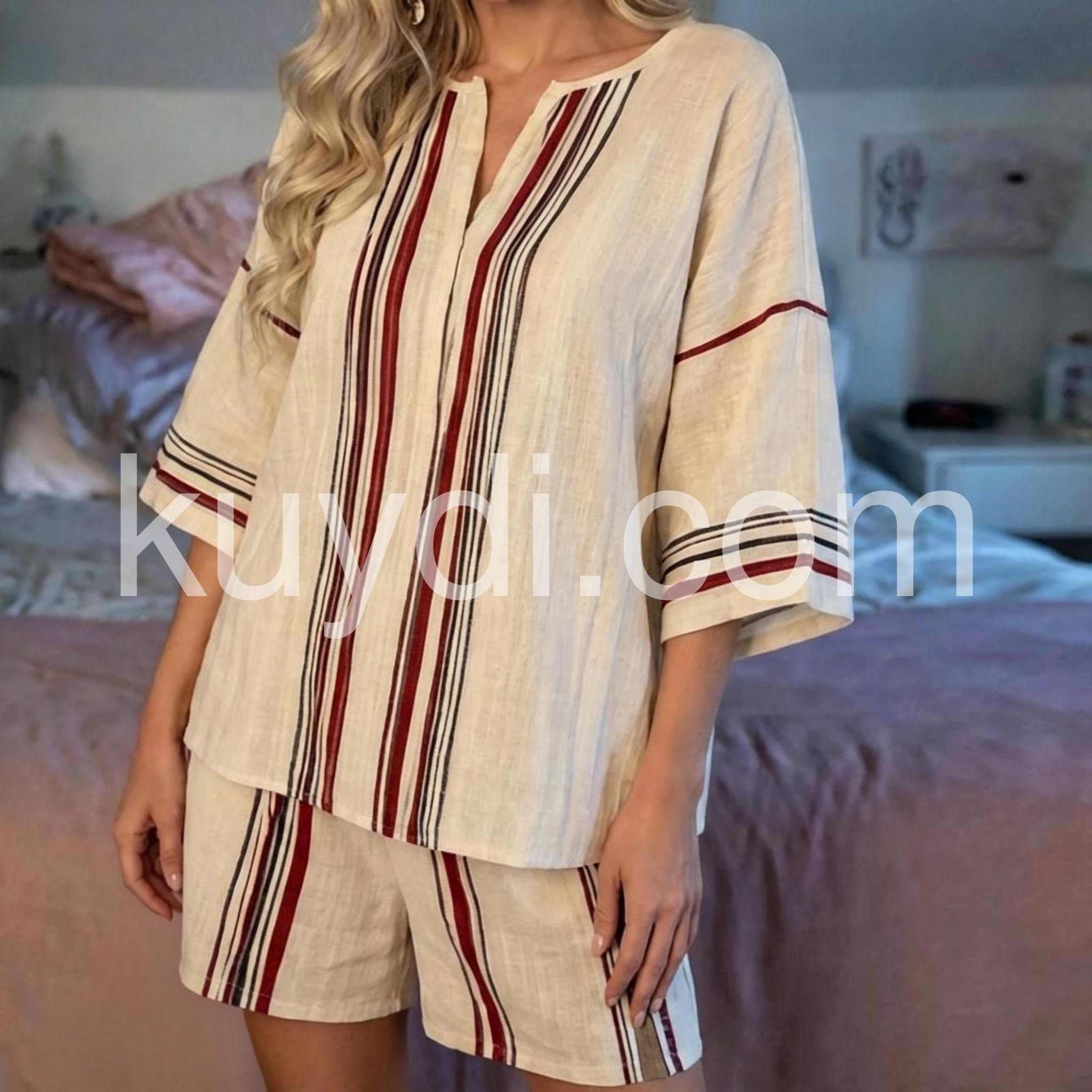 This sophisticated two-piece set features a flattering V-neck design complemented by classic striped patterns. Engineered for optimal comfort without sacrificing style, the coordinated pieces offer versatile styling options for various occasions. The thoughtfully constructed silhouette provides a polished appearance while maintaining ease of movement throughout the day.