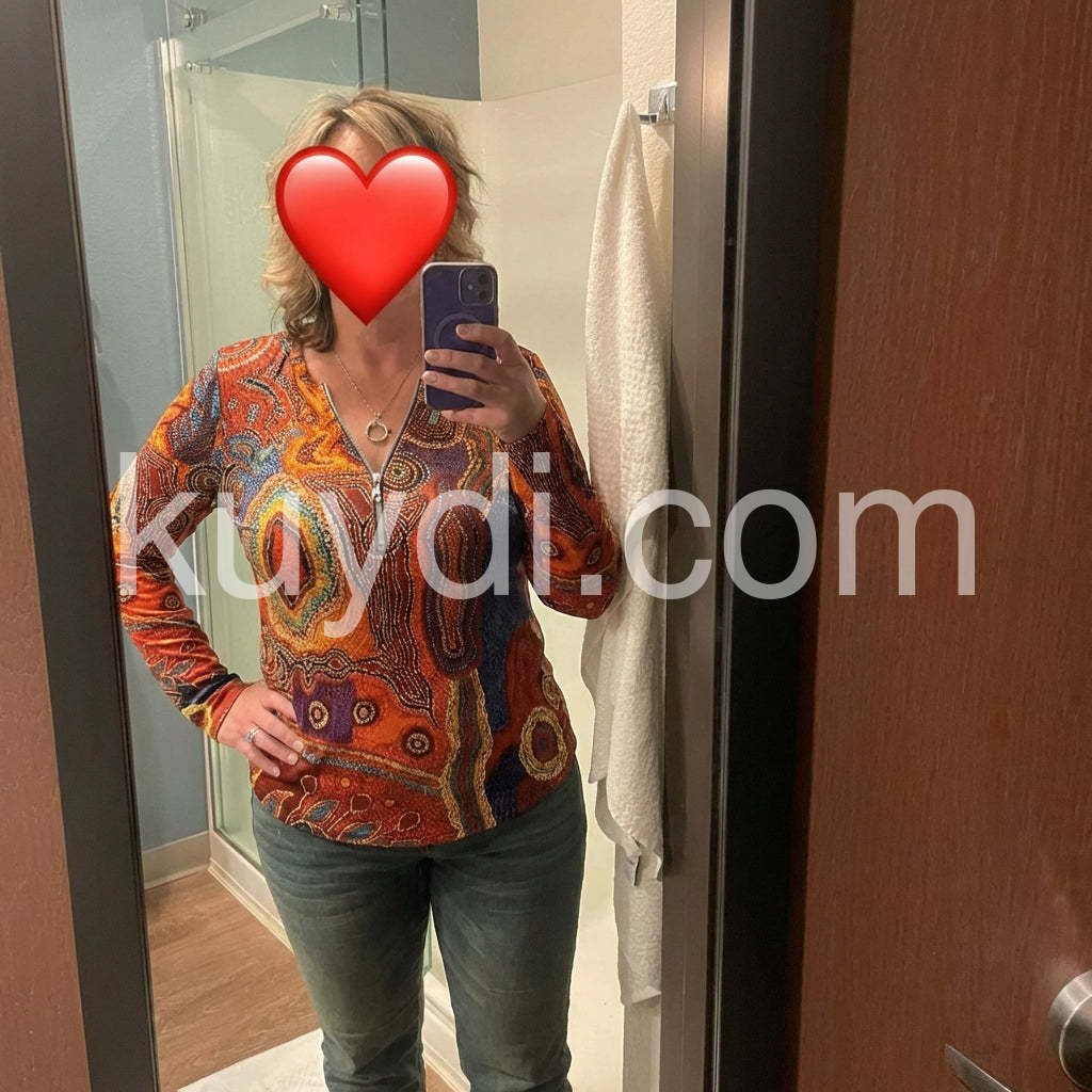 Autumn Aztec Geometric Zippered Long Sleeve Top