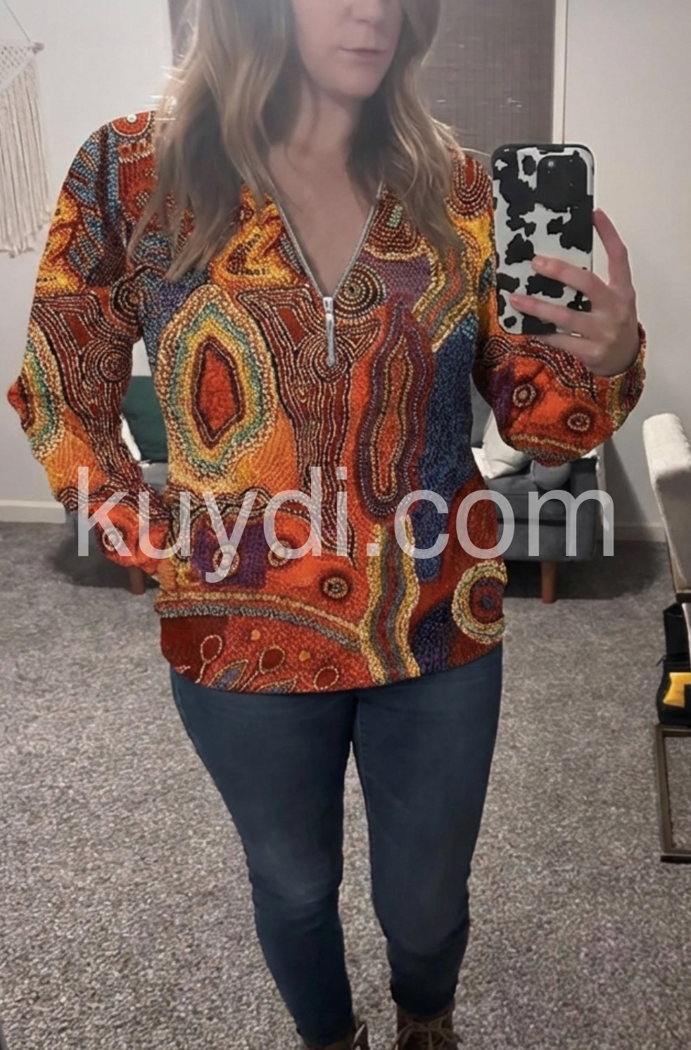 Zip it up with this autumn color casual top, featuring red, orange, blue, and yellow geometric swirls and bead print patterns. The long fitted sleeves, zippered plunging v-neckline, and waist-length silhouette give this laid-back top just the right amount of detail. Finish your look with silver or gold jewelry, jeans, and a cami underneath. Machine wash cold tumble dry low to medium heat. Iron if needed or lay flat to dry.