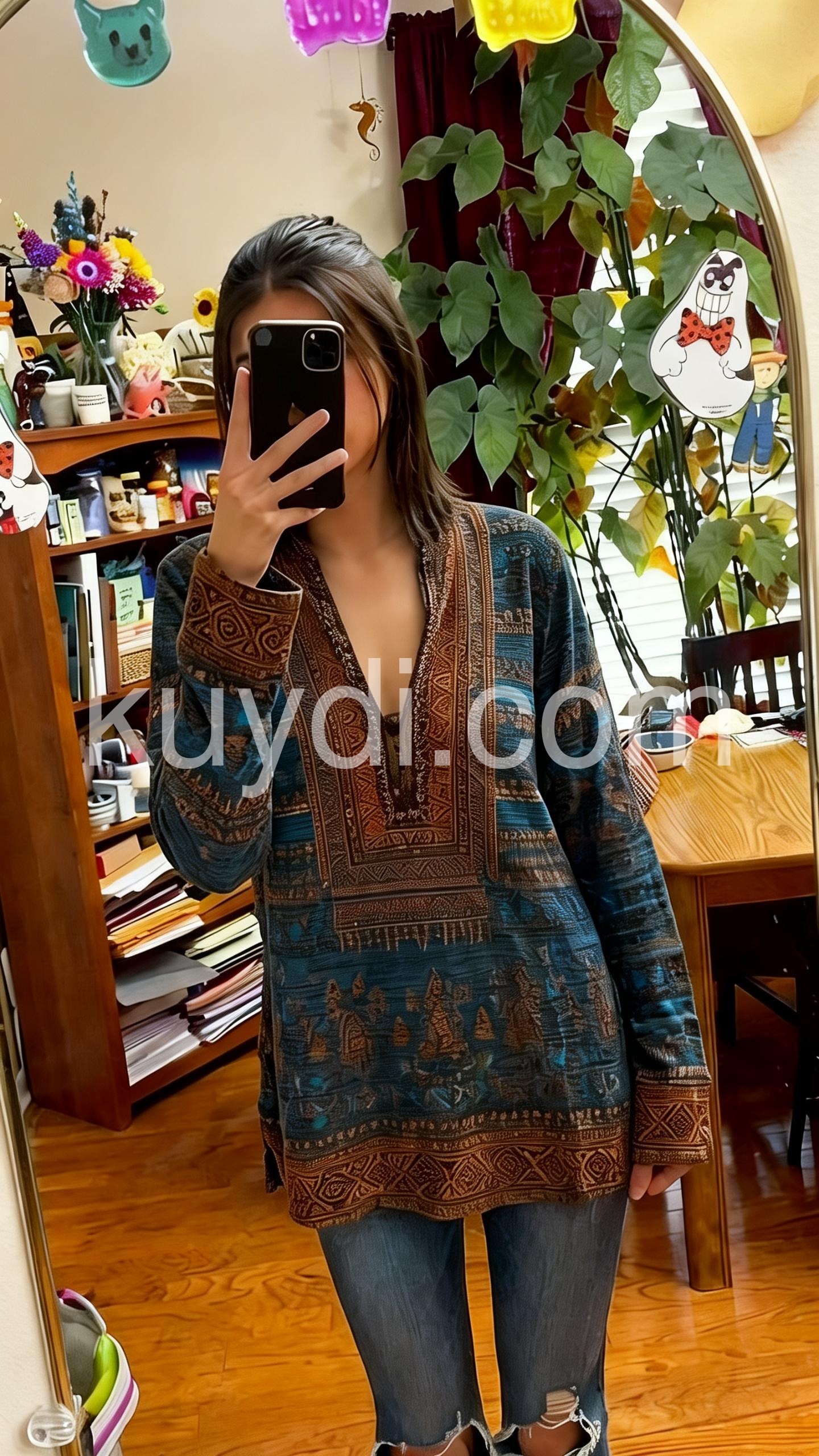 I love this tunic! The navy blue color and the detailed boho print are even prettier in person. The V-neck with the buttons looks great and the long sleeves are a perfect fit. It’s comfortable, falls nicely, and is easy to style with jeans or leggings. Looks exactly like the photos.